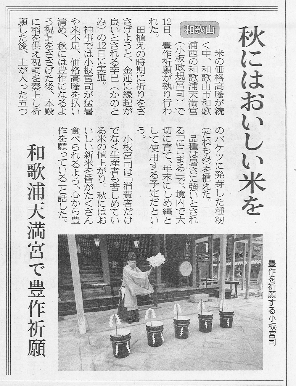米の価格高騰が続く中、和歌山市和歌浦西の和歌浦天満宮(小板政規宮司)で12日、豊作祈願が執り行われた。 わかやま新報に掲載されました。![]()