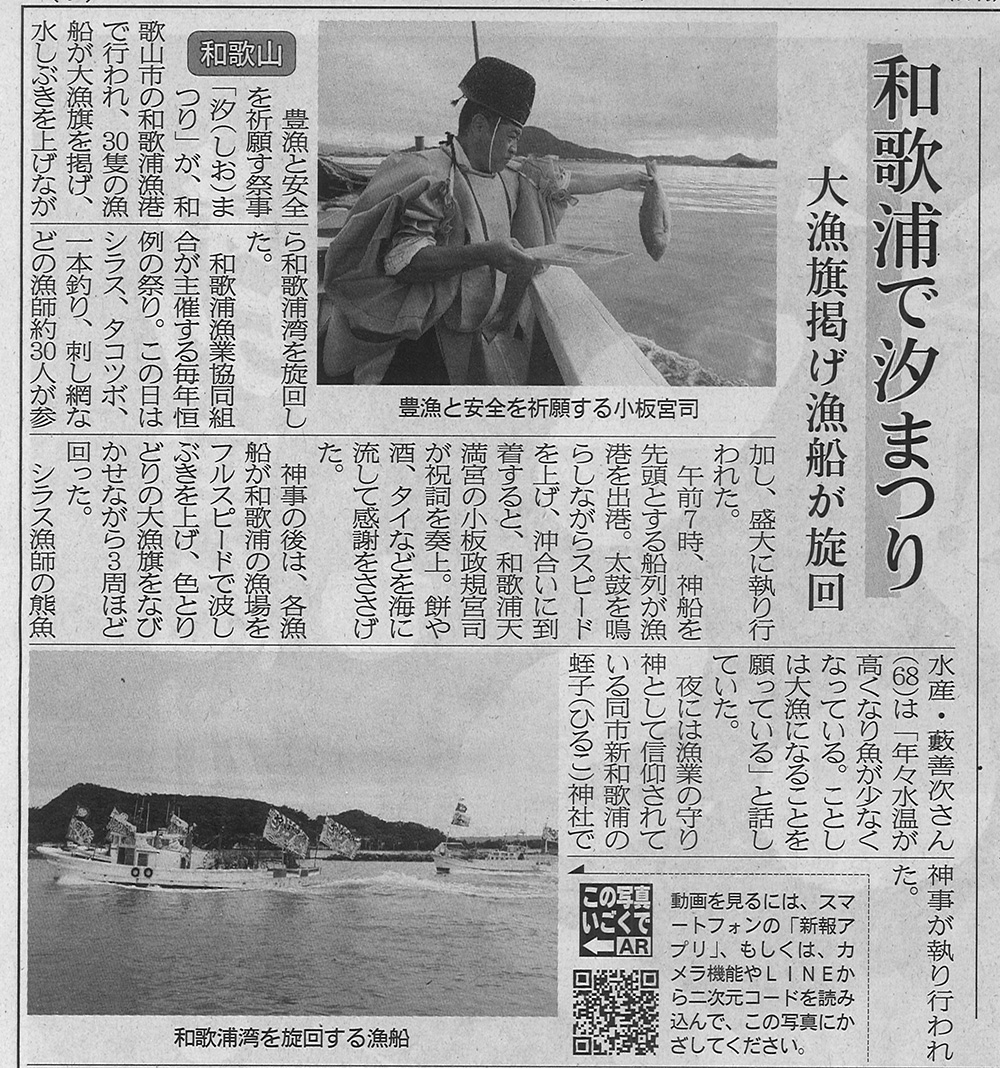 豊漁と安全を祈願す祭事「汐(しお)まつり」が、和歌山市の和歌浦漁港で行われ、30隻の漁船が大漁旗を掲げ、水しぶきを上げながら和歌浦湾を旋回した。 わかやま新報に掲載されました。![]()