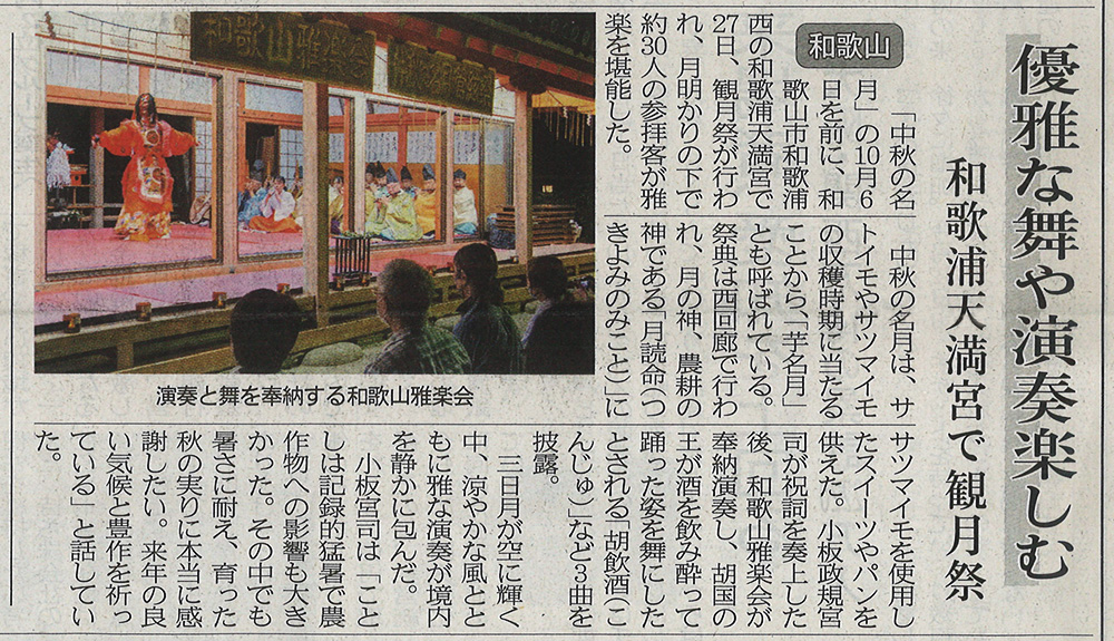 「中秋の名月」の10月6日を前に、和歌山市和歌浦西の和歌浦天満宮で27日、観月祭が行われ、月明かりの下で約30人の参拝客が雅楽を堪能した。 わかやま新報に掲載されました。![]()
