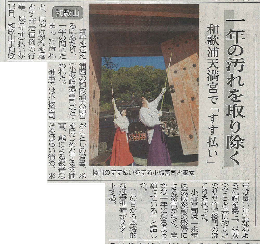 新年を迎えるにあたり、一年の間にたまった汚れと、厄やけがれを落とす師走恒例の行事、煤(すす)払いが13日、和歌山市和歌浦西の和歌浦天満宮(小板政規宮司)で行われた。 わかやま新報に掲載されました。![]()