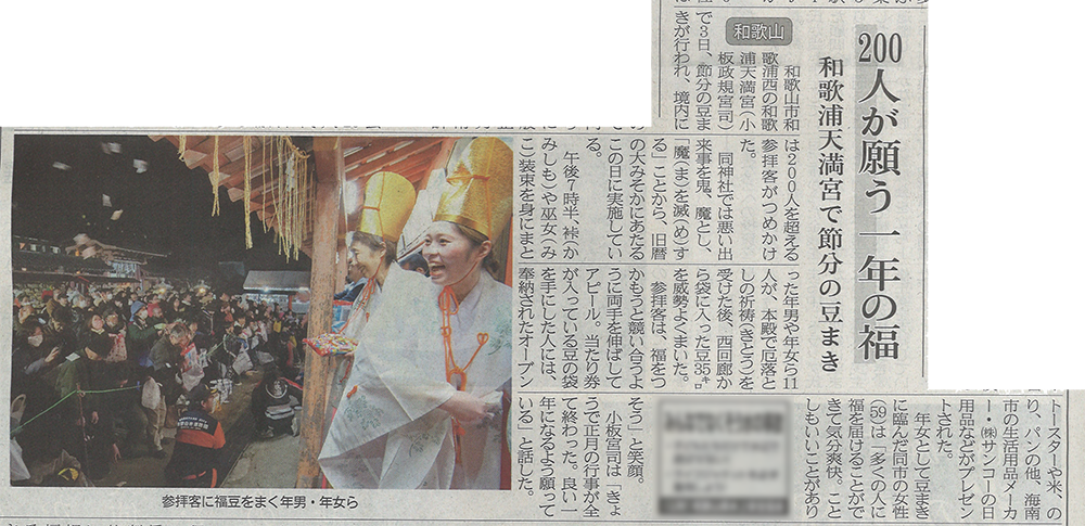和歌山市和歌浦西の和歌浦天満宮(小板政規宮司)で3日、節分の豆まきが行われ、境内には200人を超える参拝客がつめかけた。 わかやま新報に掲載されました。![]()